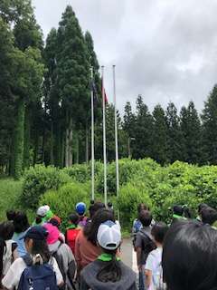 中野ビレジに着き、薄日が差す中、三宿小学校と合同で校旗掲揚です。