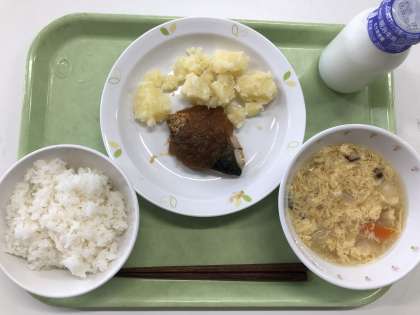 献立 ごはん 鯖のおろしだれ 粉ふき芋 かきたま汁 牛乳