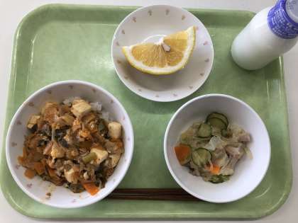 献立 豚キムチ丼 春雨サラダ 河内晩柑 牛乳