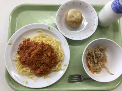 献立 ミートソーススパゲティ ベイクドポテト もやしサラダ 牛乳
