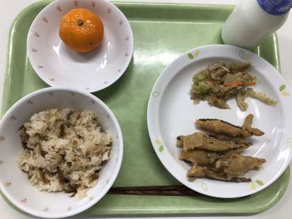 献立 鶏飯 きびなごのフリッター ごぼうサラダ 冷凍みかん 牛乳