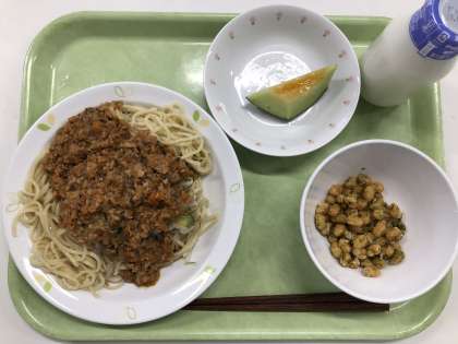 献立 ジャージャー麺 ポリポリ大豆 メロン 牛乳