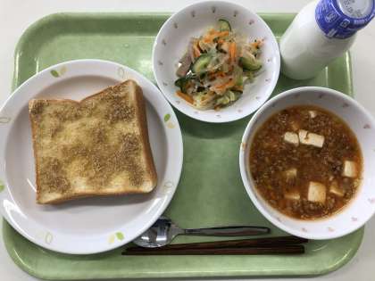 献立 セサミトースト シーホーどうふスープ 春雨サラダ 牛乳