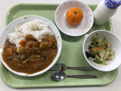 献立 夏野菜のカレー 塩昆布のサラダ 冷凍みかん 牛乳