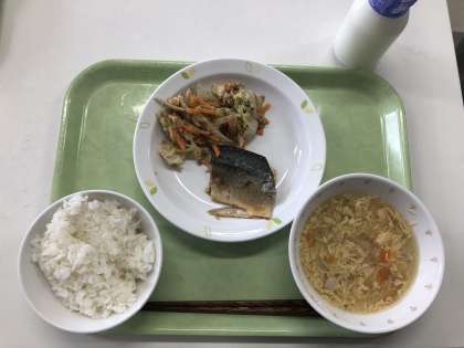 献立 ごはん さばのピリ辛焼き ごぼうサラダ かきたま汁 牛乳