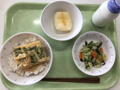 献立 親子丼 塩昆布のサラダ りんご 牛乳