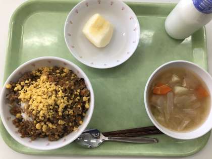 献立 大豆とごぼうのそぼろご飯 いしかり汁 りんご 牛乳
