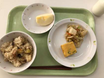 献立 吹き寄せご飯 卵焼き 白菜のおかか和え りんご 牛乳