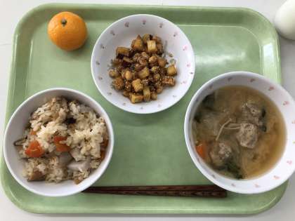 献立 里芋ごはん つみれ汁 大豆とさつま芋の甘辛煮 みかん 牛乳
