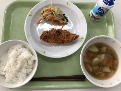 献立 ごはん 鮭の胡麻フライ 切干大根のみそドレサラダ のっぺい汁 牛乳