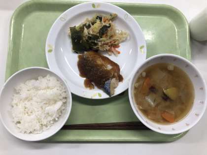 献立 ごはん さわらのおろしだれ かみかみわかめサラダ さつま汁 牛乳