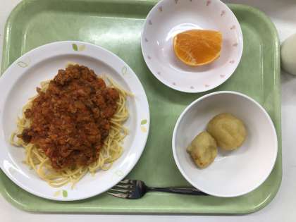 献立 きのこミートソーススパゲティ ウインナーいりじゃが芋餅 オレンジ