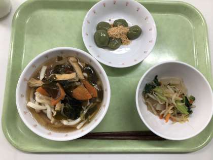 献立 わかめうどん こんにゃくサラダ 若草だんご 牛乳