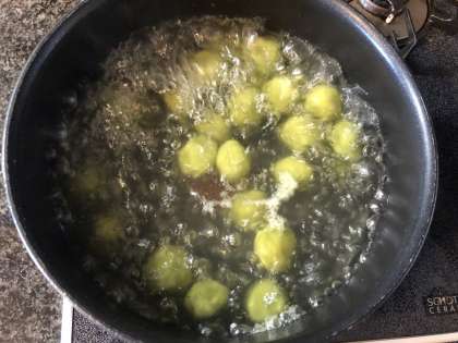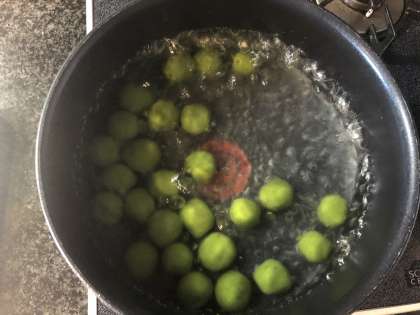 5.たっぷりの水を沸騰させ、団子を入れて茹でる。≪写真左≫