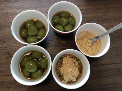 9.団子とシロップを混ぜて器によそい、きな粉をかける。≪写真右≫