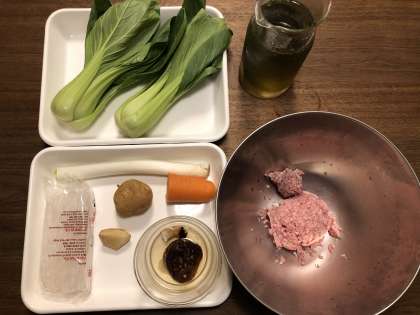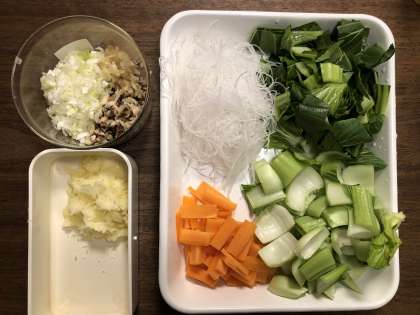 にんじんとチンゲン菜は短冊切り。チンゲン菜は茎と葉を分ける。