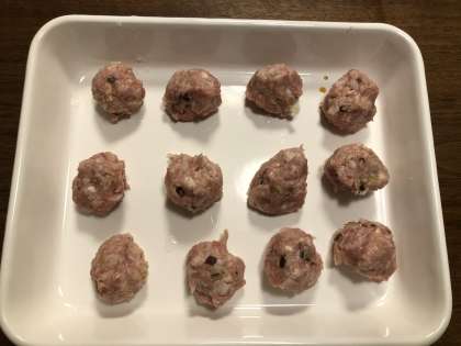 2.ひき肉に、しょうゆ、塩、酒を入れて、よくこねる。粘り気が出たら、みじん切りにした椎茸、しょうが、ねぎとじゃが芋のすりおろしを入れて、よくこねる。12等分し、丸める。 ≪写真 右≫