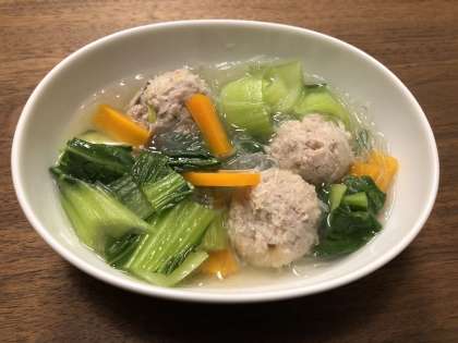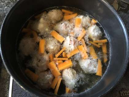 3.鍋に、だし汁とにんじんを入れて火にかける。沸騰したら、肉団子を入れて強火にする。煮立ったら、弱火にしアクをとる。蓋をして5分くらい煮る。 ≪写真左≫