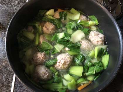 4.チンゲン菜の茎を入れて一煮立したら春雨と調味料を入れる。蓋をして2分くらい煮る。チンゲン菜の葉を入れて煮えたら出来上がり。