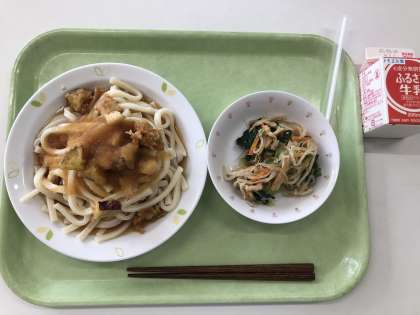 【献立】冷やしたぬきうどん 油揚げともやしの煮びたし 牛乳