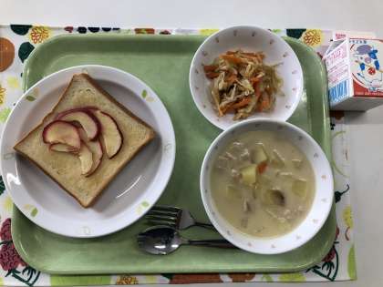 【献立】りんごトースト じゃが芋のポタージュ もやしサラダ 牛乳