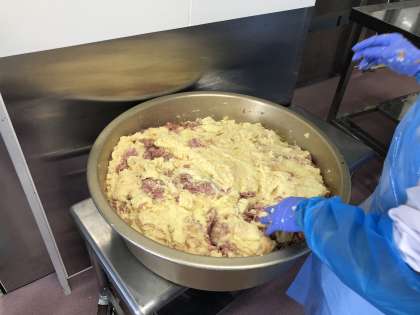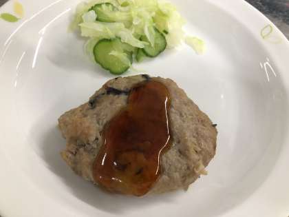 写真右 :じゃが芋のすりおろしを混ぜるところ。じゃが芋のすりおろしが、ハンバーグのつなぎになります。卵やパン粉は使わないで作れます。じゃが芋をすりおろしたときの水分で、ハンバーグのたねのかたさを調節してください。