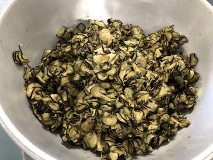 写真中央:なすは、1〜2ミリの輪切りにして、塩もみし、水気をきっておきます。