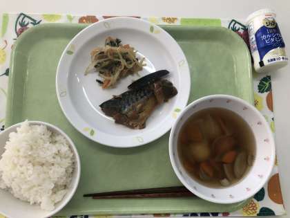 【献立】 ごはん 鯖の味噌煮 野菜のごまカレー和え ジョア