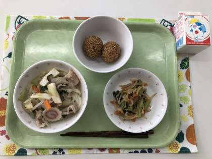 【献立】ちゃんぽんうどん さつま芋のごま団子 野菜のコチジャンダレ 牛乳
