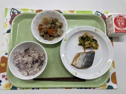 献立 黒米ごはん 魚のみそ照り焼き 野菜のおかか和え 筑前煮 牛乳