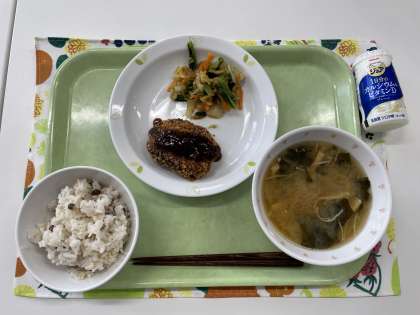 献立 五穀ご飯 ムロアジのメンチカツ やさいのポン酢和え みそ汁 ジョア