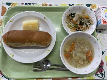 献立 ツナフムスサンド 野菜と大麦のスープ こんにゃくサラダ りんご 牛乳