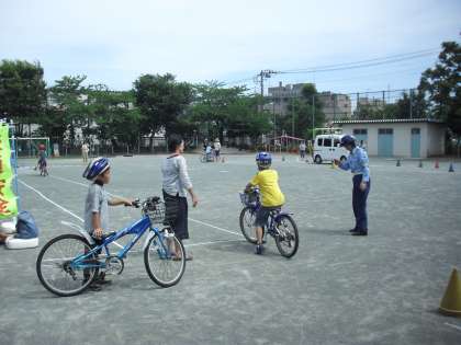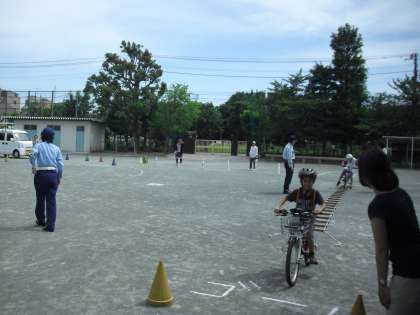 6月25日金曜日の5,6時間目に、交通安全教室が行われました。自転車の安全な乗り方・走行の仕方についての学習ということで、みんな真剣な表情で警察の方のお話を伺った後、早速自転車に乗って様々なコースを走行。「失敗したらどうなるの?」「落ちちゃったらどうしよう・・・」など不安げな表情で心配していた様子がとても印象的です。後半のジグザグに走行するところや、デコボコ道を走行するところがかなり難しいようで、ギュッとハンドルを握りしめて歯を食いしばって運転していました。警察の方や保護者の方々に助けていただき、無事ゴールまで着くとホッとした表情で「楽しかった!」と一言。終わった後の感想では、「安全運転で自転車に乗りたい。」「これからも気をつけたい。」と安全に対する心構えがしっかりと身についたようです。ご協力、どうもありがとうございました。