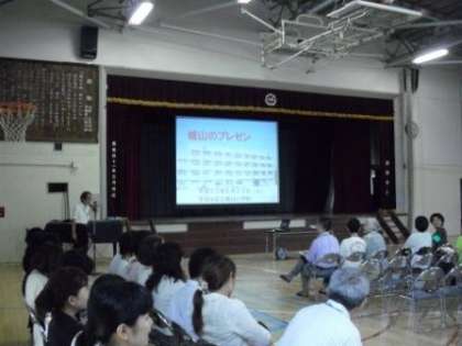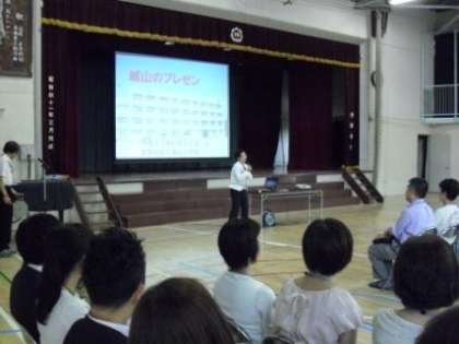 6月25日(土)の午後2時10分から3時まで、体育館で恒例の「城山プレゼン」を行いました。これは、学校公開週間中の土曜日を利用して、本校の教育活動を保護者や地域の皆様に紹介するプレゼンテーションです。