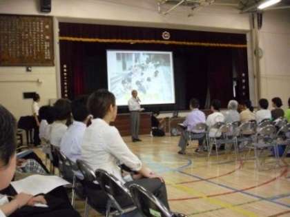 本校の教師職員が、校長・各学年・各専科・事務・給食ごとに、持ち時間2分から3分で次々と紹介していきます。各学年の日頃の取り組みの様子やエピソードを、写真や実物を使って紹介しながら、テンポ良く進めていきました。「なるほど。そうだったのか!」という内容盛りだくさんの、楽しい会になりました。