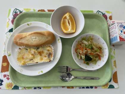 献立 ソフトフランス マカロニグラタン ブロッコリーのサラダ いよかん 牛乳