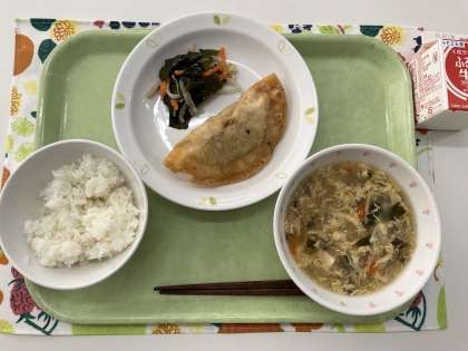 献立 ごはん ジャンボ餃子 わかめサラダ ニラ玉スープ 牛乳