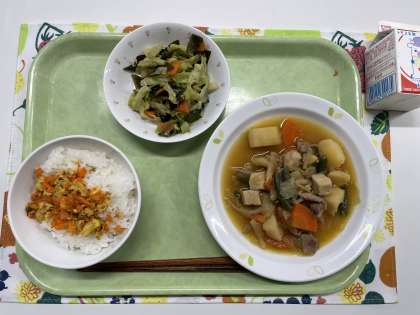 献立 ごはん にんじんしりしり 肉じゃが キャベツのレモンじょうゆ 牛乳