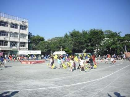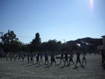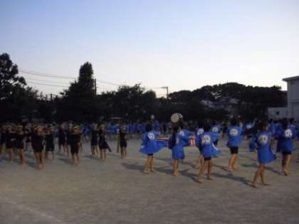 こどもまつりでは、まつりを盛り上げるために、子どもたちが運動会で踊った踊りを、再度披露します。1年生から4年生までは、私服で踊ります。体育着で踊ったときとはまた違った姿に、周囲で見守る保護者や地域の皆さんも、思わず笑顔になります。5、6年生は、もちろん、はっぴとはちまき姿です。しだいに夕闇がせまる校庭に、「どっこいしょ、どっこいしょー!」の元気な声が響きました。