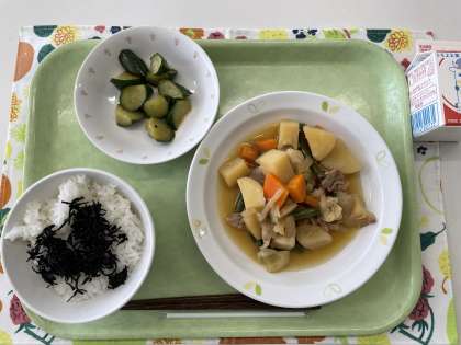 献立 ごはん ひじきふりかけ 肉じゃが きゅうりの南蛮漬け 牛乳
