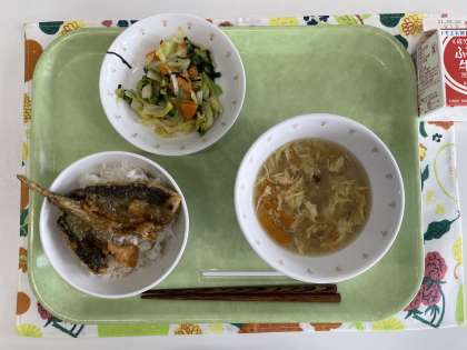 献立 あじのかば焼き丼 かきたま汁 塩昆布のサラダ 牛乳