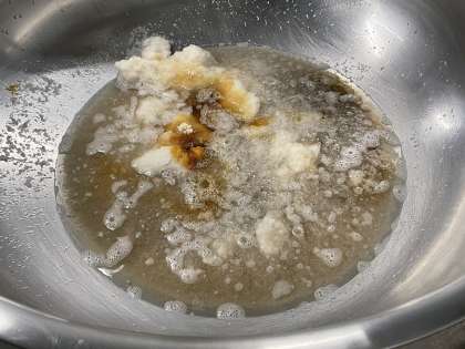 3.大根おろし、だし汁、しょうゆ、さとう、みりんを鍋に入れて一煮立ちさせる。