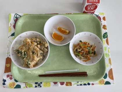 献立 親子丼 野菜のコチジャンだれ 清見オレンジ 牛乳