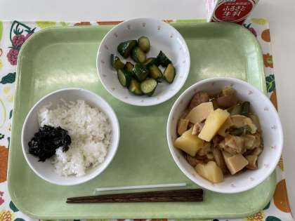 献立 ごはん のりの佃煮 車ふと根菜の煮物 きゅうりの南蛮漬け 牛乳