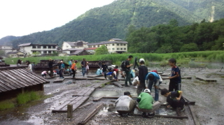 バイキングの前に、湯元の源泉を見学しました。硫黄の臭いに、驚いていました。