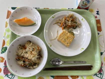 献立 明日葉ごはん 卵焼き 胡麻和え メロン 牛乳
