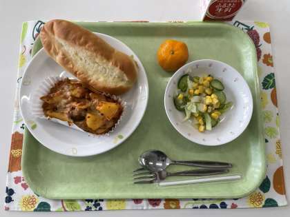 献立 ソフトフランス 夏野菜のグラタン コーンサラダ 冷凍みかん 牛乳
