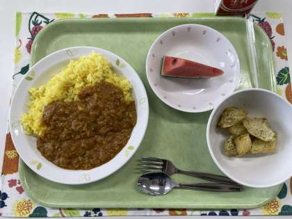 献立 キーマカレー 青のりポテト 小玉すいか 牛乳