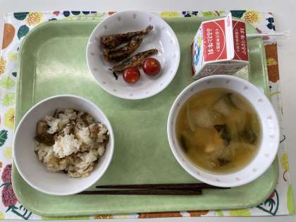 献立 とりめし 小いわしのから揚げ ミニトマト 冬瓜のみそ汁 牛乳