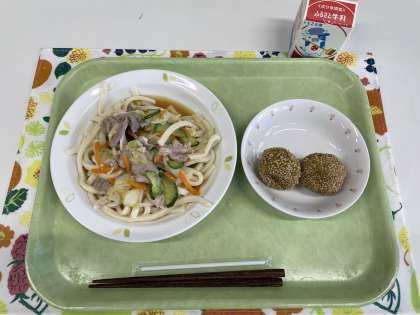 献立 ぶたしゃぶうどん さつま芋のごま団子 牛乳